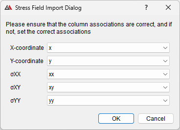 The field stress feature allows for in-situ stress fields derived from external sources (e.g., other modelling software) to be imported into Irazu. This feature requires that a CSV file containing the following columns is created: X-coordinate, Y-coordinate, σxx, σyy, and σxy (in addition, Z-coordinate, σzz, σxz, σyz for 3D models).