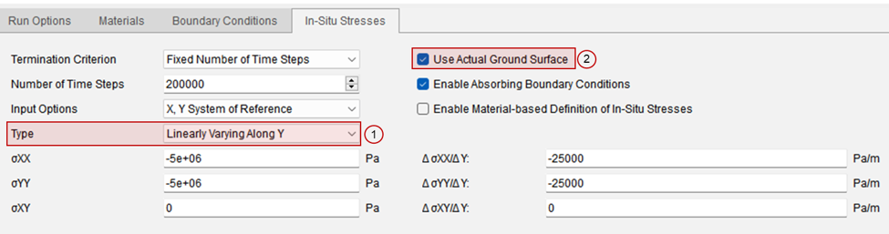 There is a new option to use the actual ground surface instead of defining a horizontal reference elevation when using the linearly varying in-situ stress type. With this method, the topography of the top surface (depending on the axis that will be linearly varied) is the datum when calculating the linearly varied in-situ stress for each element.