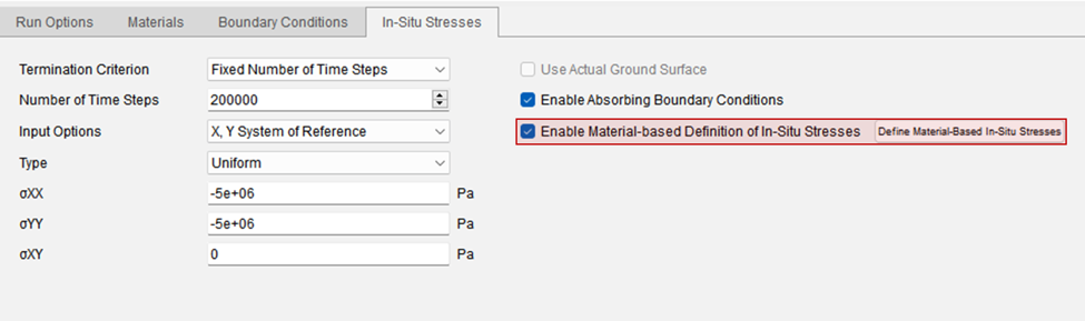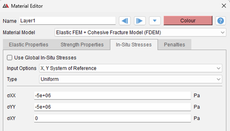 Under the In-Situ Stresses tab in Irazu, Enable Material-based definition of In-Situ Stresses and click the Define Material-Based In-Situ Stresses. This will bring you to the In-Situ Stresses tab in the Material Editor. By default, all materials will use the global in-situ stress definition. When this option is disabled, the in-situ stress for each material can be defined with cartesian system and principal stress Input Options and uniform and linearly varying Type.